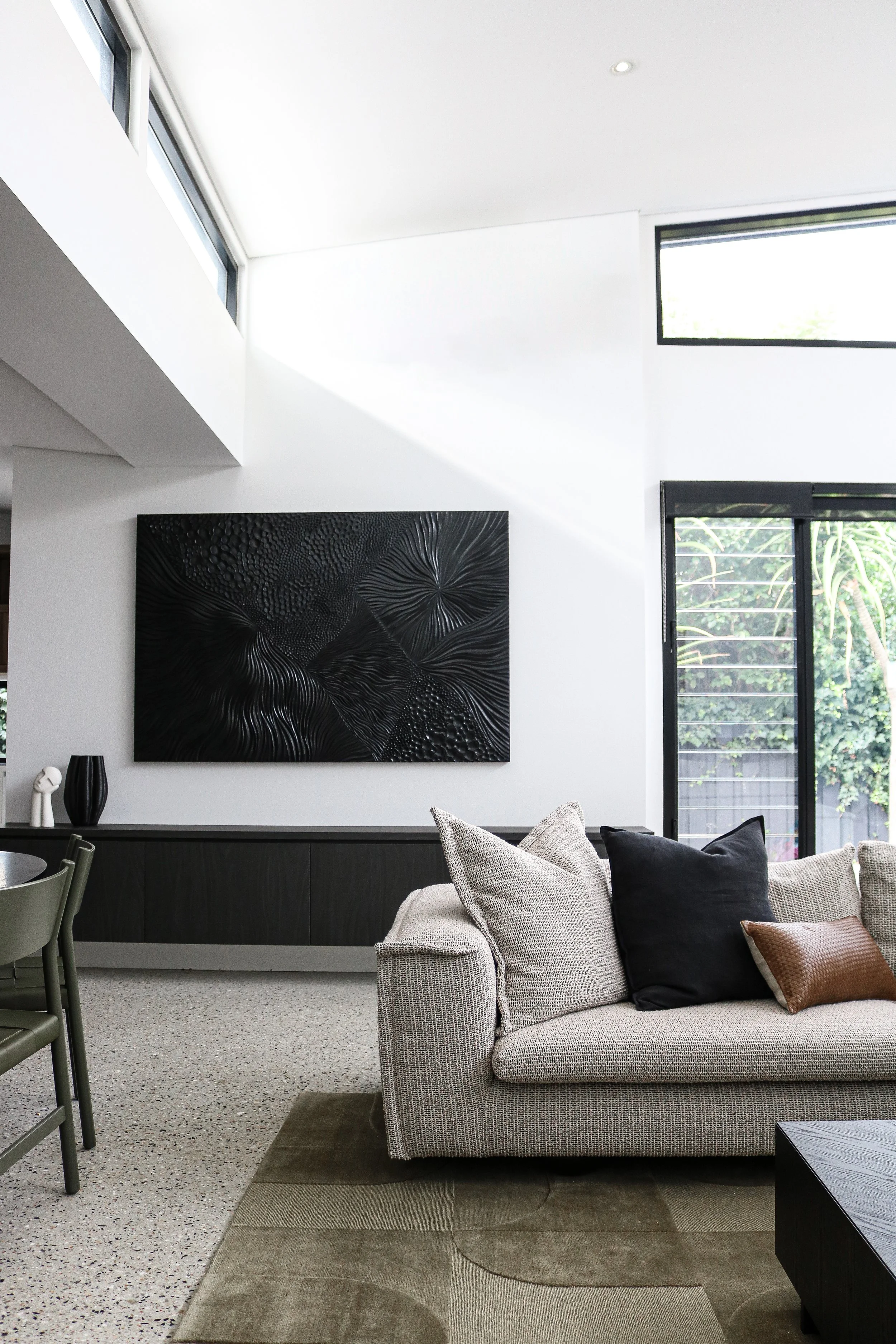 Modern dining room with black table and chairs, large abstract black and gray artwork on white wall, decorative black and white vases, and large windows with a view of greenery outside.